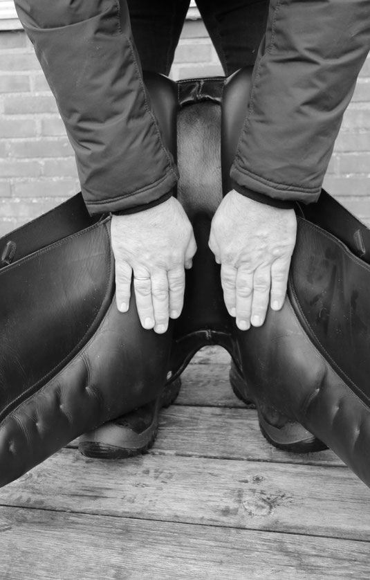 Daarna zal Gabriël het paard bekijken, het zadel, maar ook zal hij kijken naar het geheel van ruiter/amazone op het zadel te paard. Als het zadel qua pasvorm mooi ligt op het paard kijkt hij of